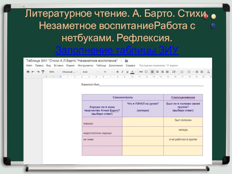 Слайд 20Литературное чтение. А. Барто. Стихи. Незаметное воспитаниеРабота с нетбуками. Рефлексия.
