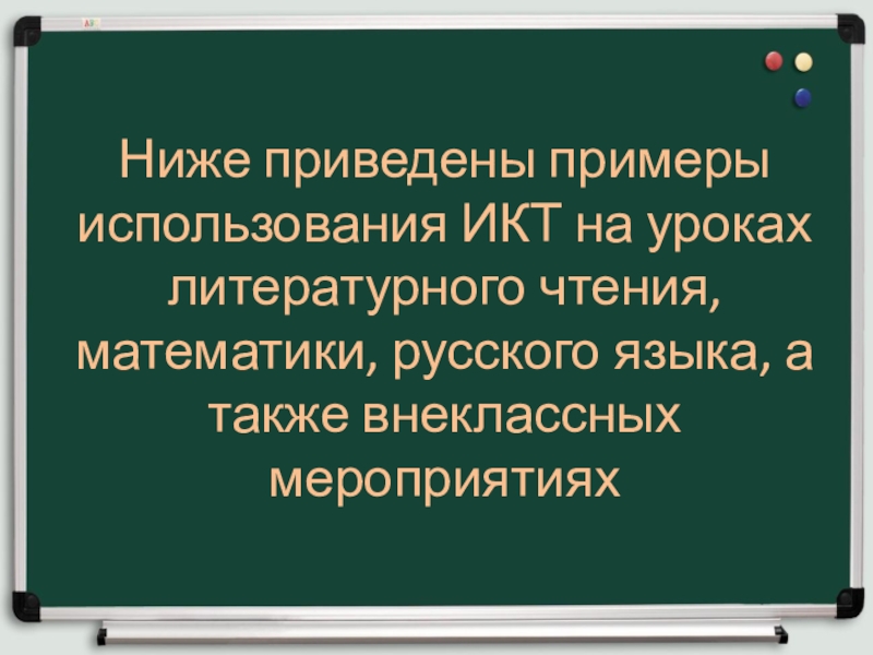 Слайд 15Ниже приведены примеры использования ИКТ на уроках литературного чтения, математики, русского