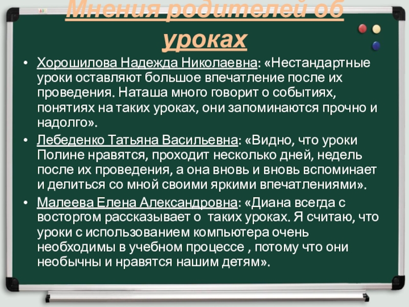 Малеева Елена Александровна: «Диана всегда с восторгом рассказывает о таких уроках. Я считаю, что уроки с использованием компьютера очень необходимы в учебном процессе , потому что они необычны и нравятся нашим детям».