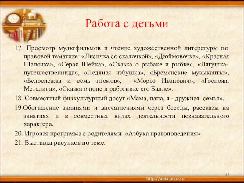 17. Просмотр мультфильмов и чтение художественной литературы по правовой