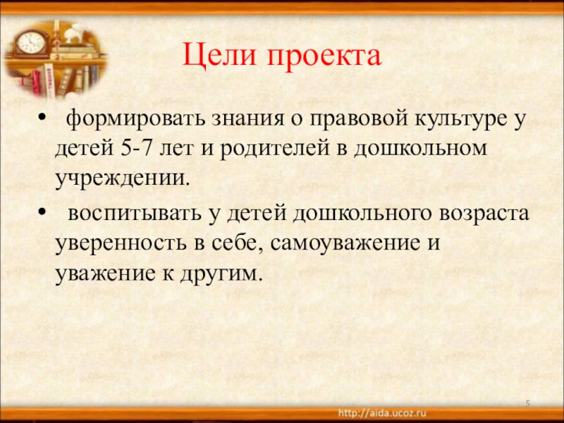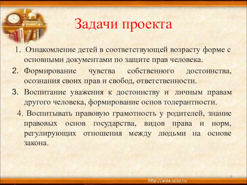4. Воспитывать правовую грамотность у родителей, знание правовых основ государства, видов права и норм, регулирующих отношения между людьми на основе закона.