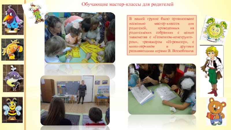 В нашей группе было организовано несколько мастер-классов для родителей, проведенных на родительских собраниях с целью знакомства с «Геоконтом-конструкто- ром», тренажером «Игровизор», с мини-ларчиком и другими развивающими играми В. Воскобовича