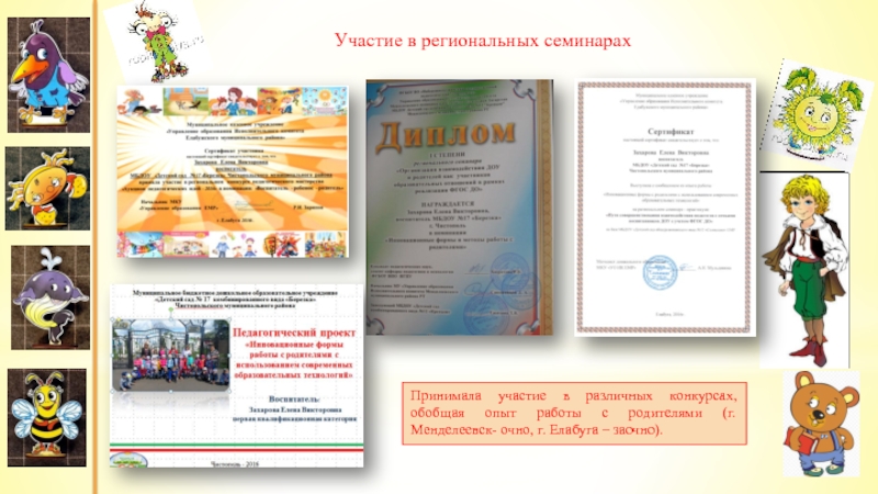Принимала участие в различных конкурсах, обобщая опыт работы с родителями (г. Менделеевск- очно, г. Елабуга – заочно).