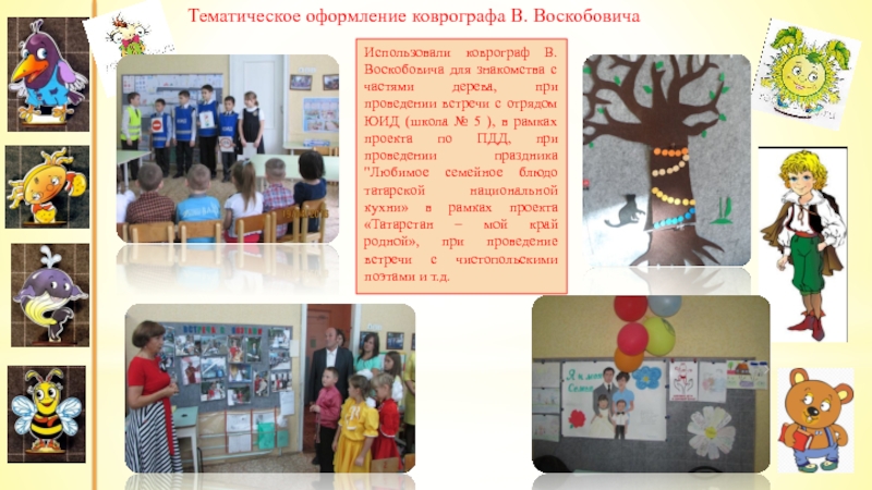 Использовали коврограф В. Воскобовича для знакомства с частями дерева, при проведении встречи с отрядом ЮИД (школа № 5 ), в рамках проекта по ПДД, при проведении праздника "Любимое семейное блюдо татарской национальной кухни» в рамках проекта «Татарстан – мой край родной», при проведение встречи с чистопольскими поэтами и т.д.