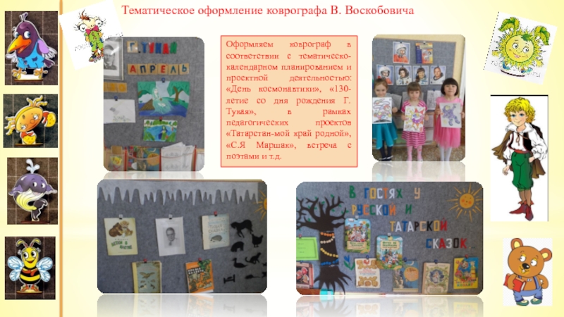 Оформляем коврограф в соответствии с тематическо-календарном планированием и проектной деятельностью: «День космонавтики», «130-летие со дня рождения Г. Тукая», в рамках педагогических проектов «Татарстан-мой край родной», «С.Я Маршак», встреча с поэтами и т.д.