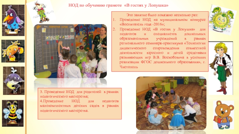 Проведение НОД «В гостях у Лопушка» для педагогов и специалистов дошкольных образовательных учреждений в рамках регионального семинара-практикума «Технология дидактического сопровождения совместной деятельности взрослого и детей средствами развивающих игр В.В. Воскобовича в условиях реализации ФГОС дошкольного образования», г. Чистополь