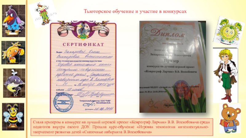 Стала призером в конкурсе на лучший игровой проект «Коврограф Ларчик» В.В. Воскобовича среди педагогов внутри своего ДОУ. Прошла курс-обучение «Игровая технология интеллектуально-творческого развития детей «Сказочные лабиринта В.Воскобовича»