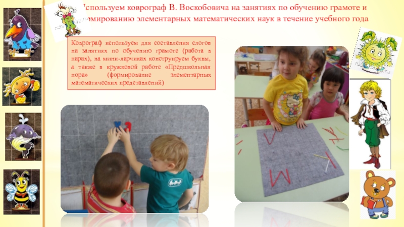 Коврограф используем для составления слогов на занятиях по обучению грамоте (работа в парах), на мини-ларчиках конструируем буквы, а также в кружковой работе «Предшкольная пора» (формирование элементарных математических представлений)