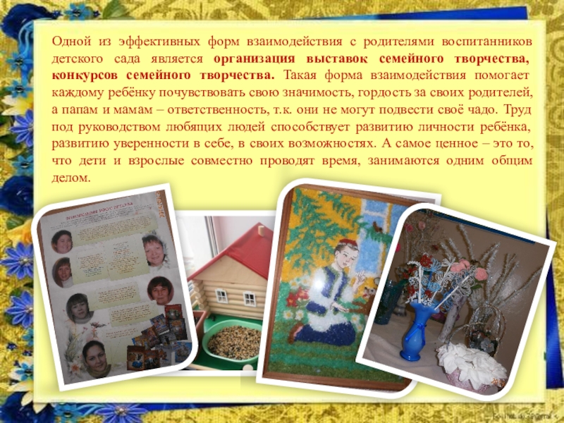 организация выставок семейного творчества, конкурсов семейного творчества. Такая форма взаимодействия помогает каждому ребёнку почувствовать свою значимость, гордость за своих родителей, а папам и мамам – ответственность, т.к. они не могут подвести своё чадо. Труд под руководством любящих людей способствует развитию личности ребёнка, развитию уверенности в себе, в своих возможностях. А самое ценное – это то, что дети и взрослые совместно проводят время, занимаются одним общим делом.