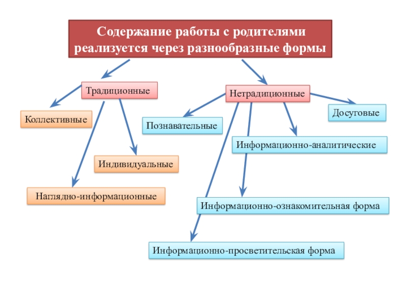 Слайд 4 Содержание работы с родителями реализуется через разнообразные формы
