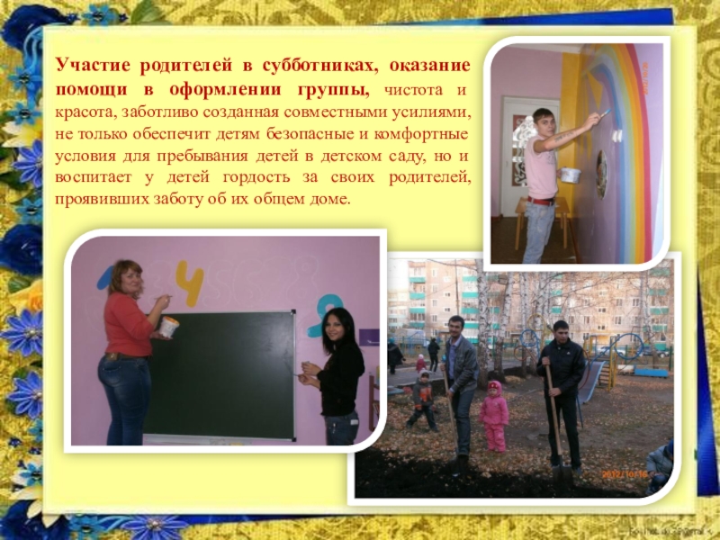Слайд 9Участие родителей в субботниках, оказание помощи в оформлении группы, чистота и