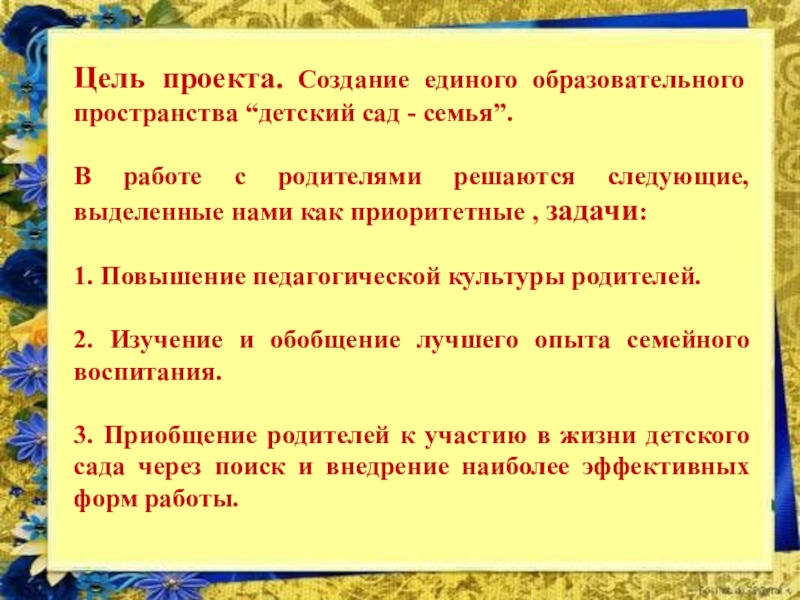 Слайд 2Цель проекта. Создание единого образовательного пространства “детский сад - семья”.