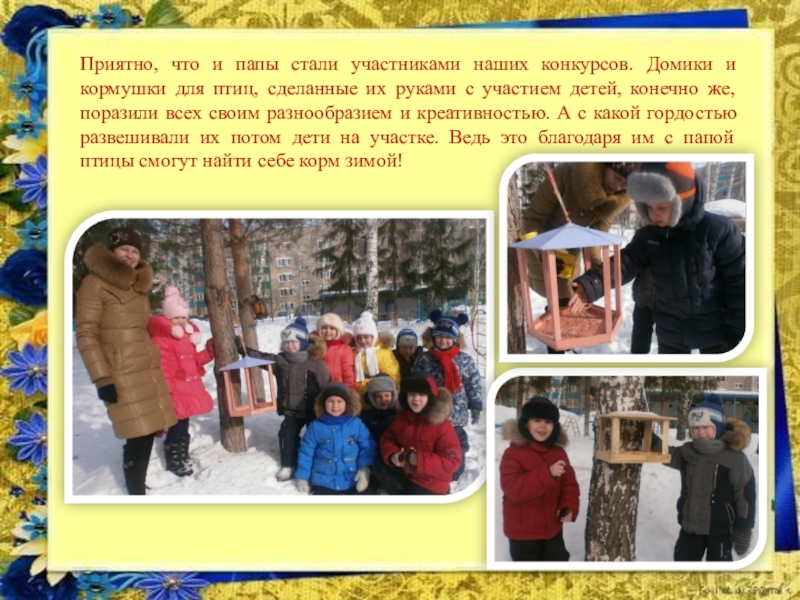 Слайд 14Приятно, что и папы стали участниками наших конкурсов. Домики и кормушки