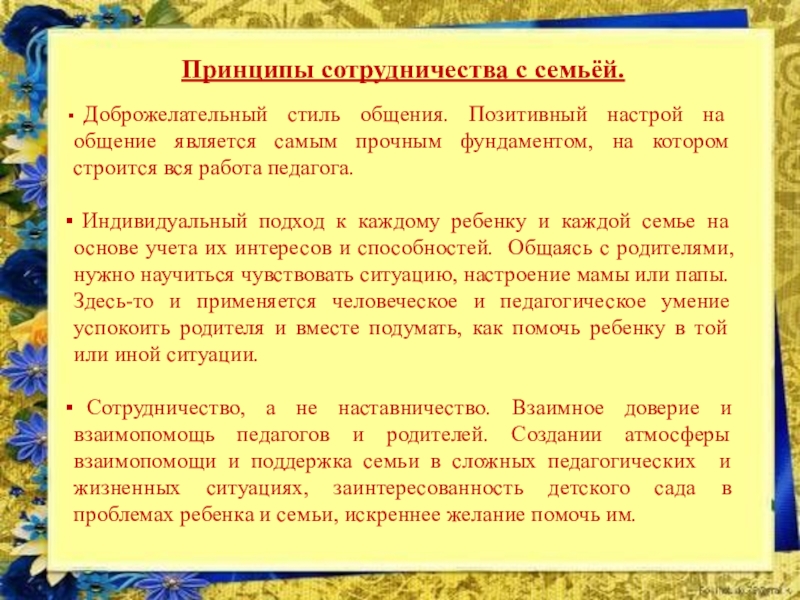 Сотрудничество, а не наставничество. Взаимное доверие и взаимопомощь педагогов и родителей. Создании атмосферы взаимопомощи и поддержка семьи в сложных педагогических и жизненных ситуациях, заинтересованность детского сада в проблемах ребенка и семьи, искреннее желание помочь им.