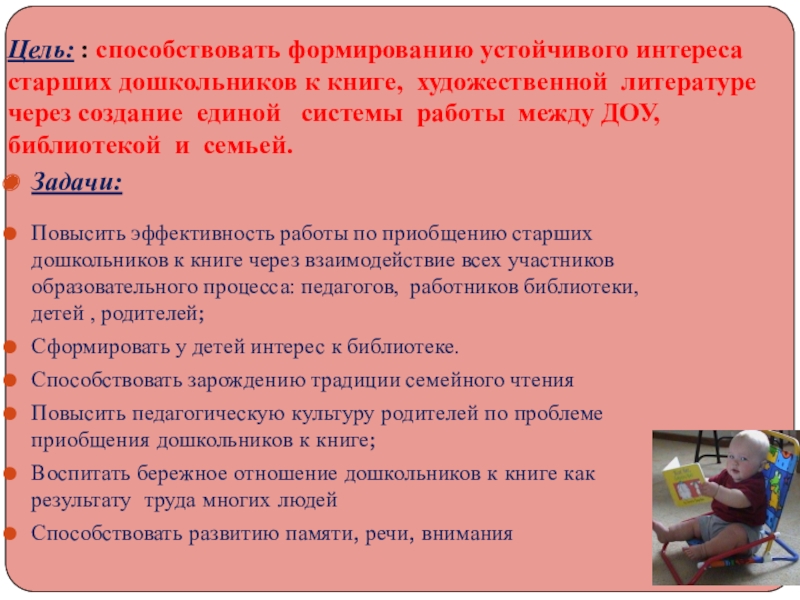 Повысить эффективность работы по приобщению старших дошкольников к книге через взаимодействие всех участников образовательного процесса: педагогов, работников библиотеки, детей , родителей;