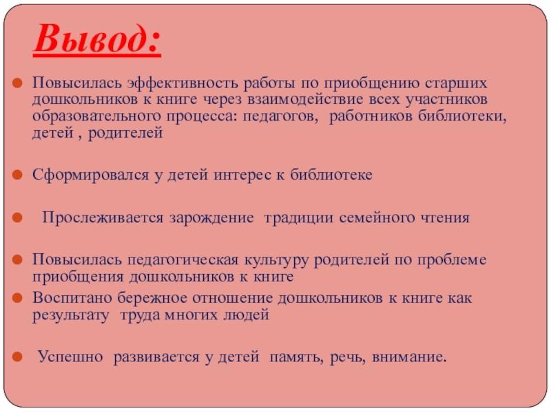 У детей появился устойчивый интерес к чтению, к книге, к библиотеке. Дети стали проявлять бережное отношение к книге.