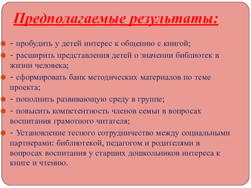 Повысить педагогическую культуру родителей по проблеме приобщения дошкольников к книге;