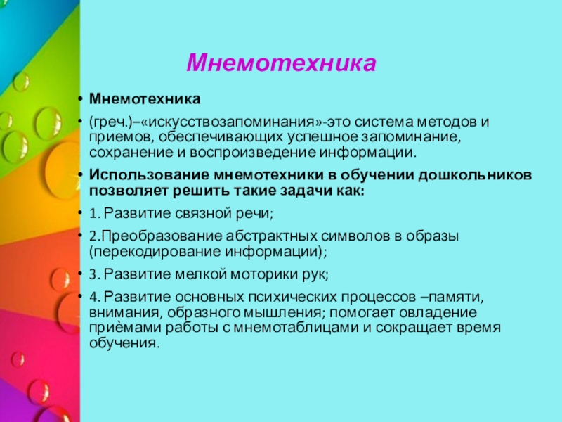 (греч.)–«искусствозапоминания»-это система методов и приемов, обеспечивающих успешное запоминание, сохранение и воспроизведение