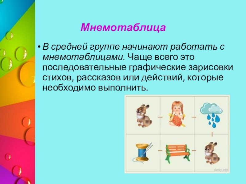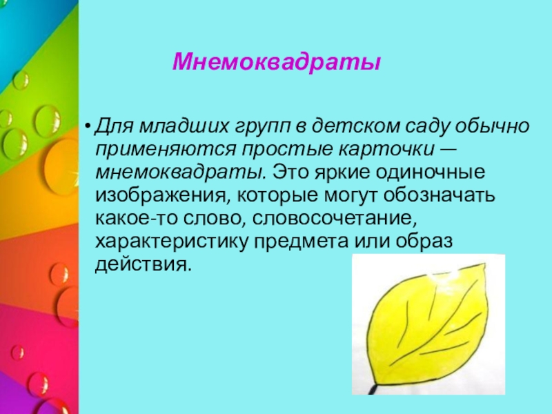 — мнемоквадраты. Это яркие одиночные изображения, которые могут обозначать какое-то слово, словосочетание, характеристику предмета или образ действия.