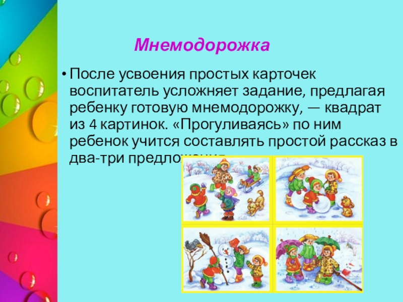 мнемодорожку, — квадрат из 4 картинок. «Прогуливаясь» по ним ребенок учится составлять простой рассказ в два-три предложения.