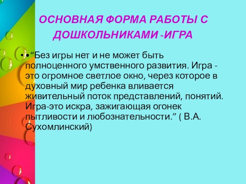 может быть полноценного умственного развития. Игра -это огромное светлое окно, через которое в духовный мир ребенка вливается живительный поток представлений, понятий. Игра-это искра, зажигающая огонек пытливости и любознательности.” ( В.А. Сухомлинский)