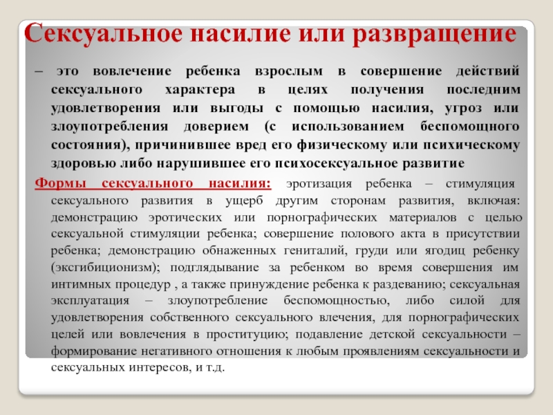 Формы сексуального насилия: эротизация ребенка – стимуляция сексуального развития в ущерб другим сторонам развития, включая: демонстрацию эротических или порнографических материалов с целью сексуальной стимуляции ребенка; совершение полового акта в присутствии ребенка; демонстрацию обнаженных гениталий, груди или ягодиц ребенку (эксгибиционизм); подглядывание за ребенком во время совершения им интимных процедур , а также принуждение ребенка к раздеванию; сексуальная эксплуатация – злоупотребление беспомощностью, либо силой для удовлетворения собственного сексуального влечения, для порнографических целей или вовлечения в проституцию; подавление детской сексуальности – формирование негативного отношения к любым проявлениям сексуальности и сексуальных интересов, и т.д.