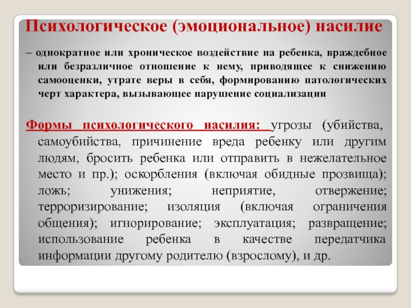 Формы психологического насилия: угрозы (убийства, самоубийства, причинение вреда ребенку или другим людям, бросить ребенка или отправить в нежелательное место и пр.); оскорбления (включая обидные прозвища);ложь; унижения; неприятие, отвержение; терроризирование; изоляция (включая ограничения общения); игнорирование; эксплуатация; развращение; использование ребенка в качестве передатчика информации другому родителю (взрослому), и др.