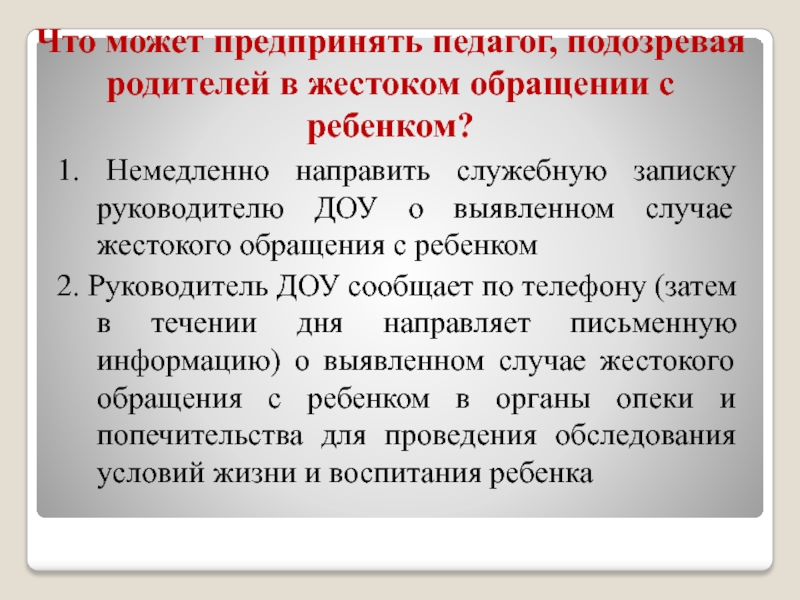Слайд 12Что может предпринять педагог, подозревая родителей в жестоком обращении с ребенком?