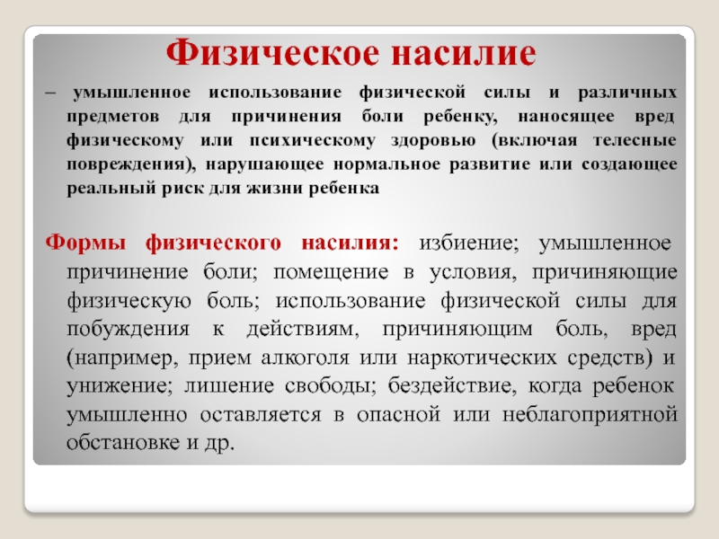 Формы физического насилия: избиение; умышленное причинение боли; помещение в условия, причиняющие физическую боль; использование физической силы для побуждения к действиям, причиняющим боль, вред (например, прием алкоголя или наркотических средств) и унижение; лишение свободы; бездействие, когда ребенок умышленно оставляется в опасной или неблагоприятной обстановке и др.