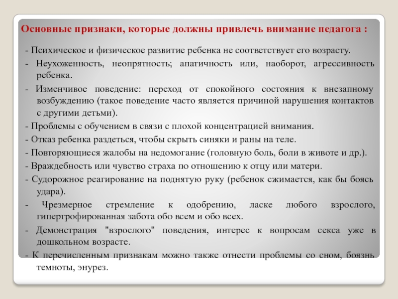 Слайд 8Основные признаки, которые должны привлечь внимание педагога :