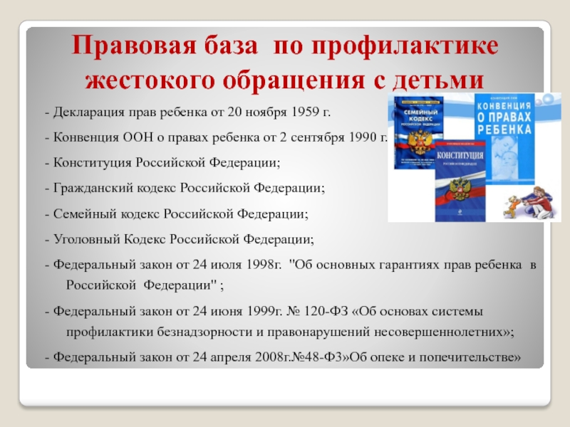 Слайд 2Правовая база по профилактике жестокого обращения с детьми
