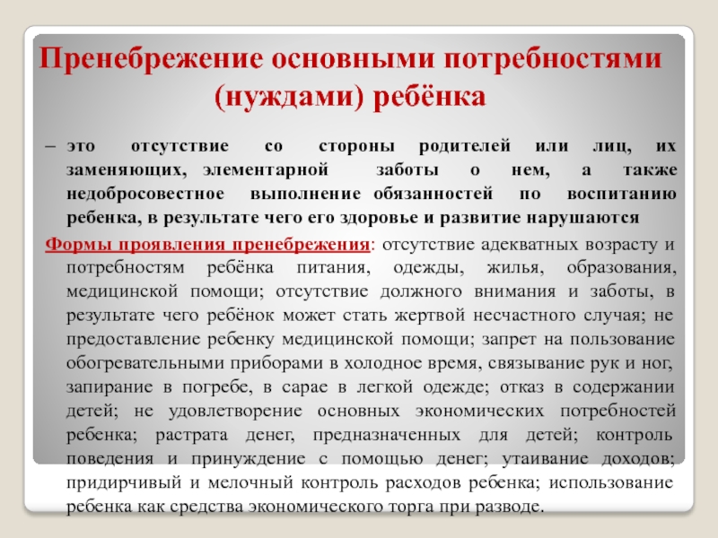Слайд 7Пренебрежение основными потребностями (нуждами) ребёнка