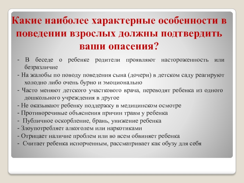 Слайд 11Какие наиболее характерные особенности в поведении взрослых должны подтвердить ваши опасения?