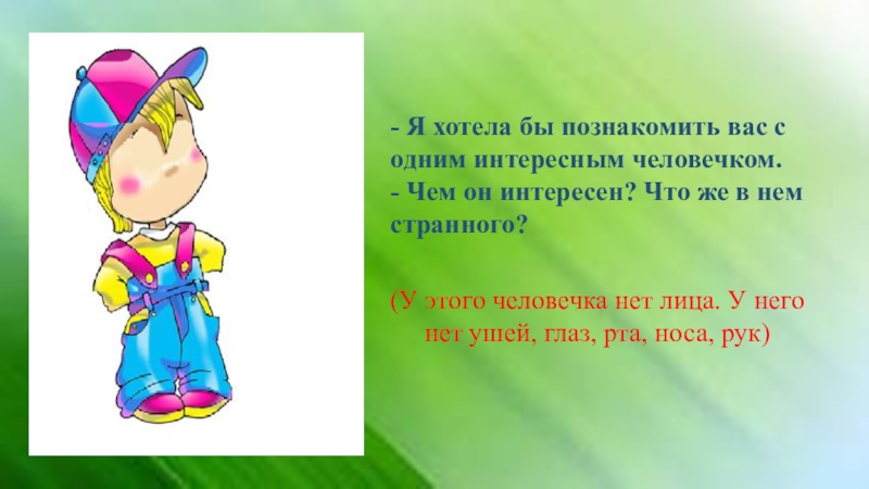 (У этого человечка нет лица. У него нет ушей, глаз, рта, носа, рук)