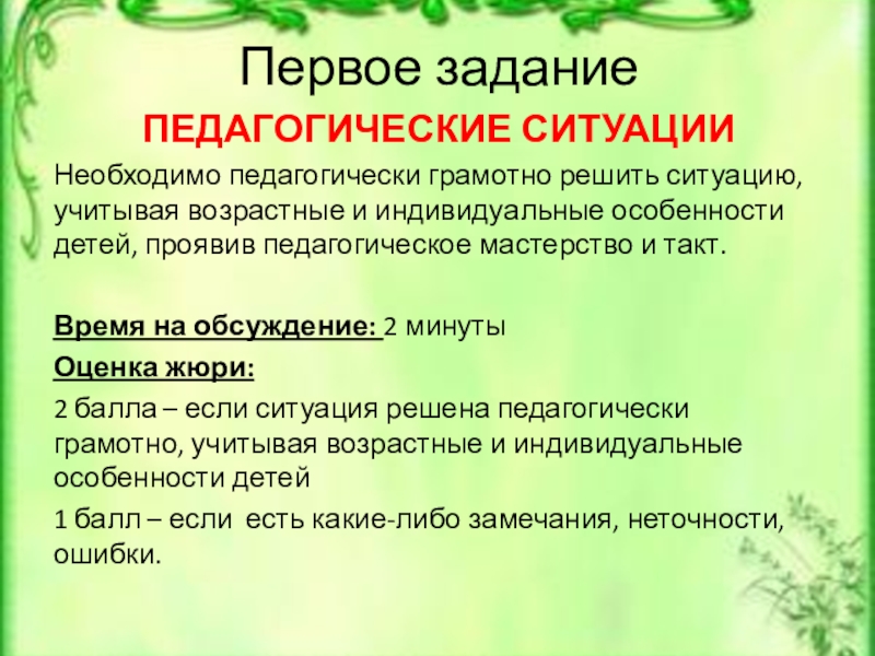 Первое заданиеПЕДАГОГИЧЕСКИЕ СИТУАЦИИНеобходимо педагогически грамотно решить ситуацию, учитывая возрастные и индивидуальные особенности детей, проявив педагогическое мастерство и