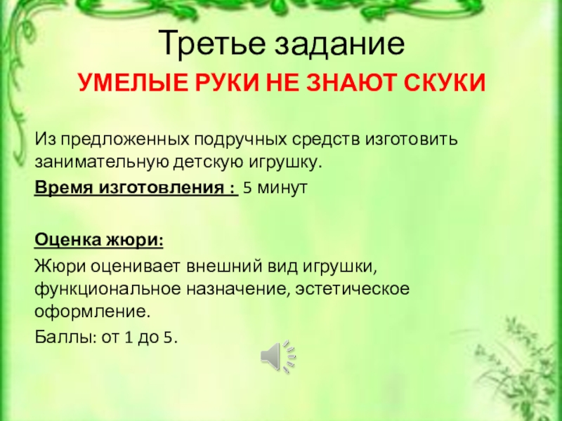 Третье заданиеУМЕЛЫЕ РУКИ НЕ ЗНАЮТ СКУКИИз предложенных подручных средств изготовить занимательную детскую игрушку.Время изготовления : 5 минутОценка