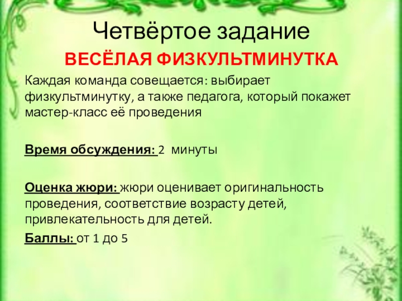 Четвёртое заданиеВЕСЁЛАЯ ФИЗКУЛЬТМИНУТКАКаждая команда совещается: выбирает физкультминутку, а также педагога, который покажет мастер-класс её проведенияВремя обсуждения: 2