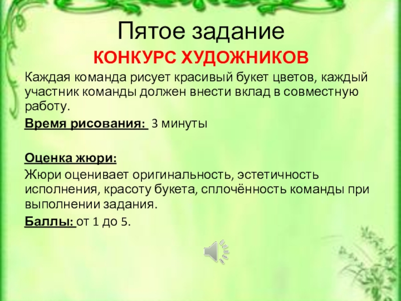 Пятое заданиеКОНКУРС ХУДОЖНИКОВКаждая команда рисует красивый букет цветов, каждый участник команды должен внести вклад в совместную работу.Время