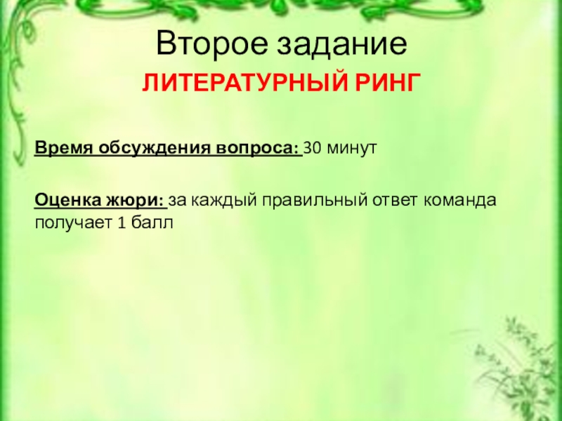Второе заданиеЛИТЕРАТУРНЫЙ РИНГВремя обсуждения вопроса: 30 минутОценка жюри: за каждый правильный ответ команда получает 1 балл