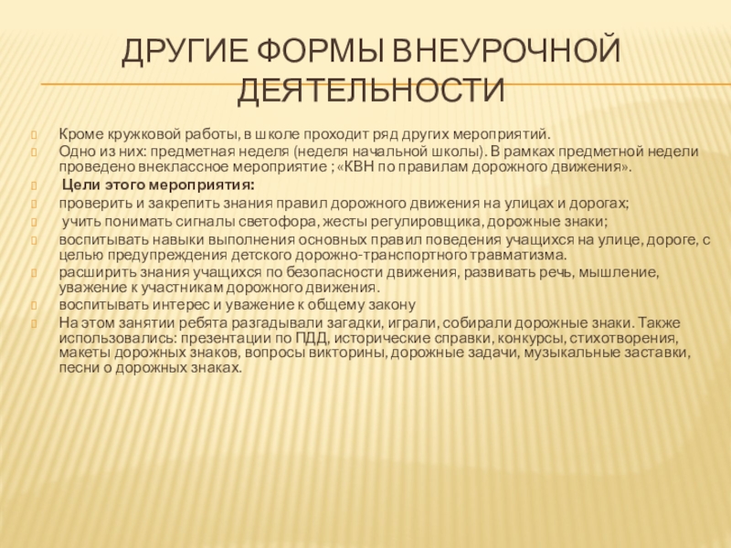Одно из них: предметная неделя (неделя начальной школы). В рамках предметной недели проведено внеклассное мероприятие ; «КВН по правилам дорожного движения».