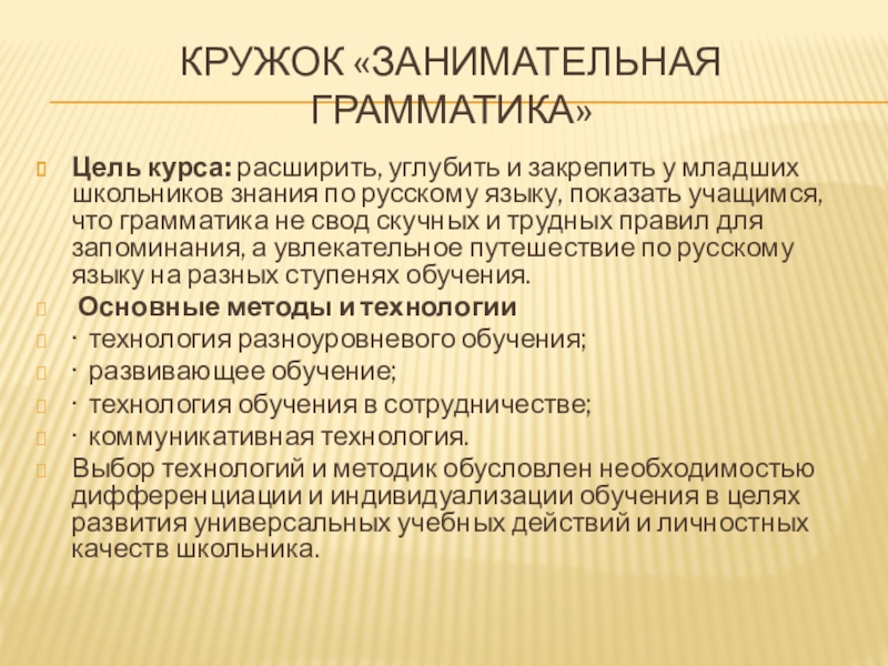 по русскому языку, показать учащимся, что грамматика не свод скучных и трудных правил для запоминания, а увлекательное путешествие по русскому языку на разных ступенях обучения.