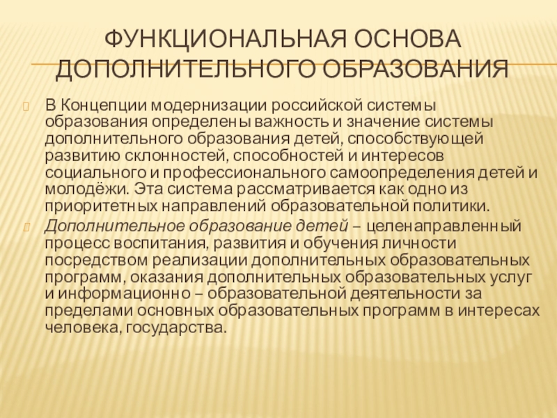 Дополнительное образование детей – целенаправленный процесс воспитания, развития и обучения личности посредством реализации дополнительных образовательных программ, оказания дополнительных образовательных услуг и информационно – образовательной деятельности за пределами основных образовательных программ в интересах человека, государства.