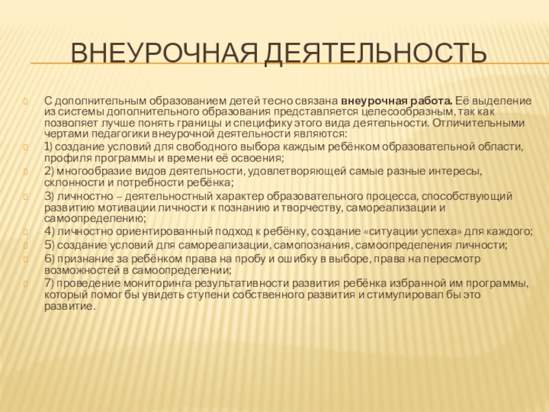 из системы дополнительного образования представляется целесообразным, так как позволяет лучше понять границы и специфику этого вида деятельности. Отличительными чертами педагогики внеурочной деятельности являются: