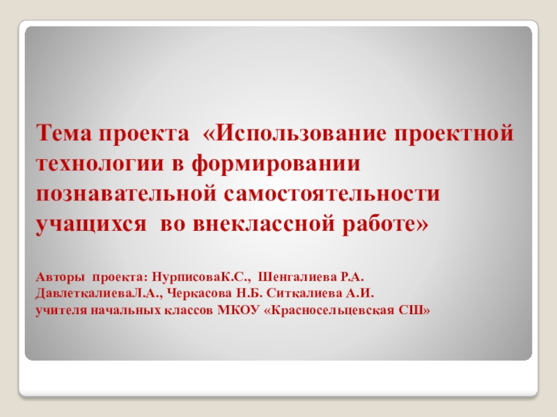 Слайд 1Тема проекта «Использование проектной технологии в формировании познавательной самостоятельности учащихся во