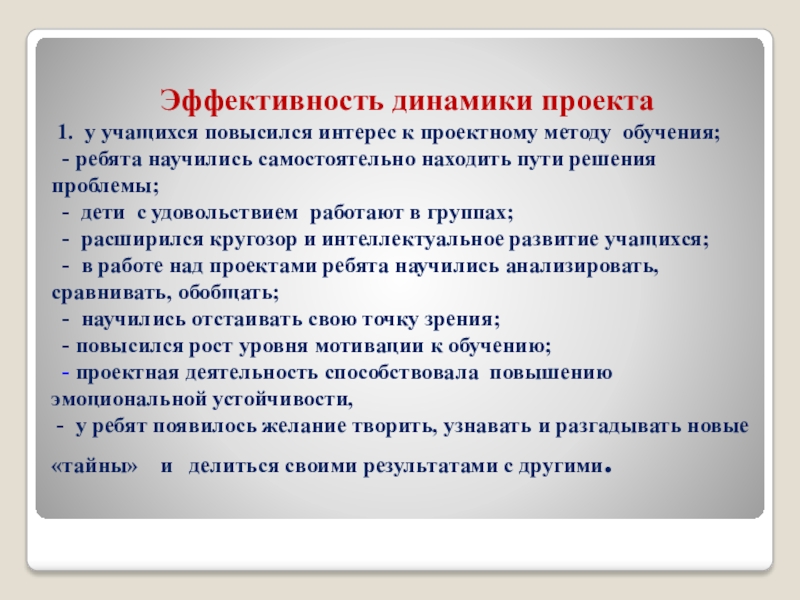 Таким образом, удалось повысить степень самостоятельности, инициативности учащихся и их познавательной мотивированности; способствовать развитию социальных навыков школьников в процессе групповых взаимодействий, приобретению детьми опыта исследовательско-творческой деятельности.