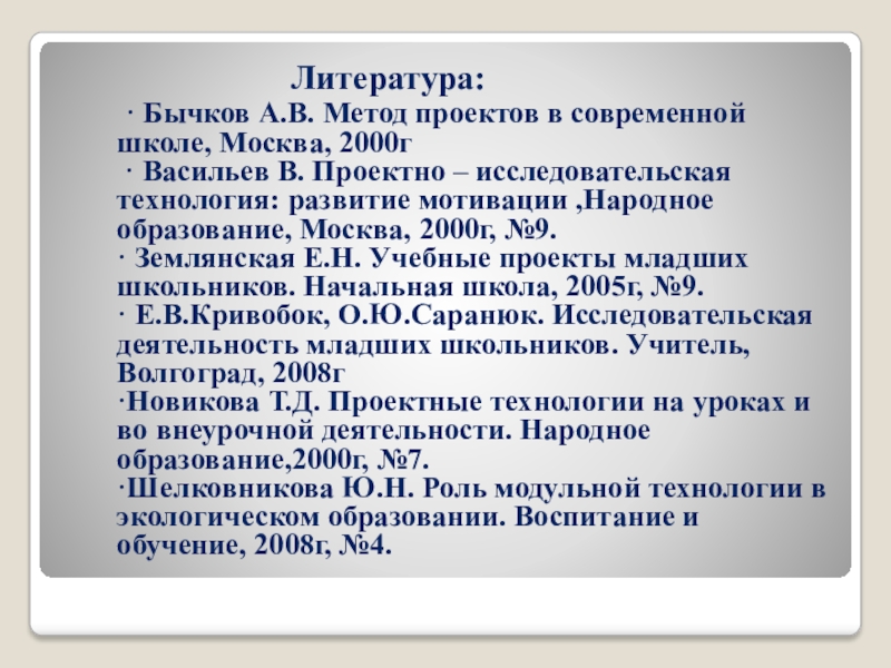 · Бычков А.В. Метод проектов в современной школе, Москва, 2000г