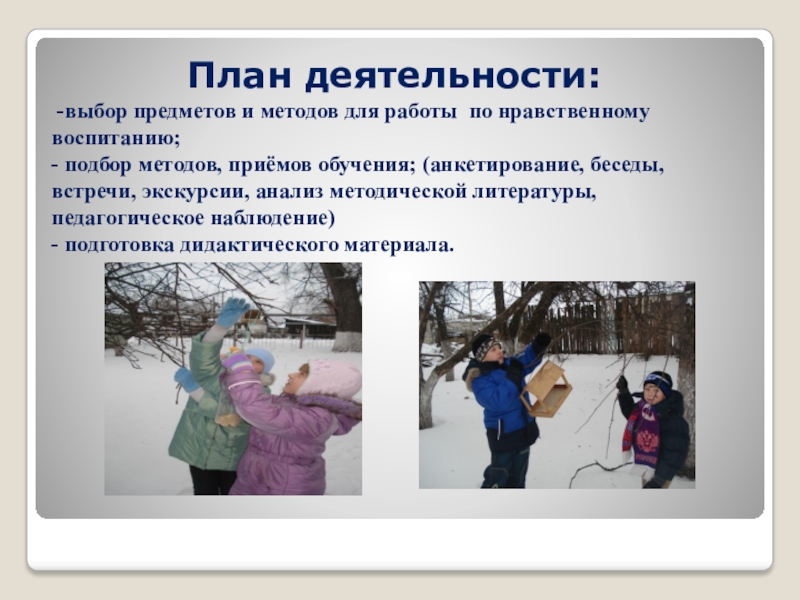 -выбор предметов и методов для работы по нравственному воспитанию;