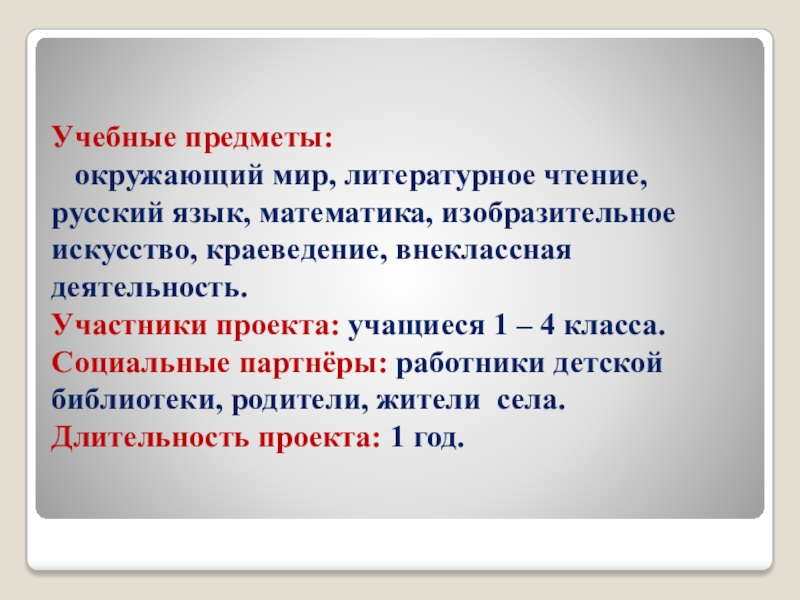 Социальные партнёры: работники детской библиотеки, родители, жители села.