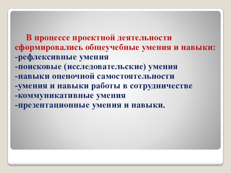 Слайд 17 В процессе проектной деятельности сформировались общеучебные умения и