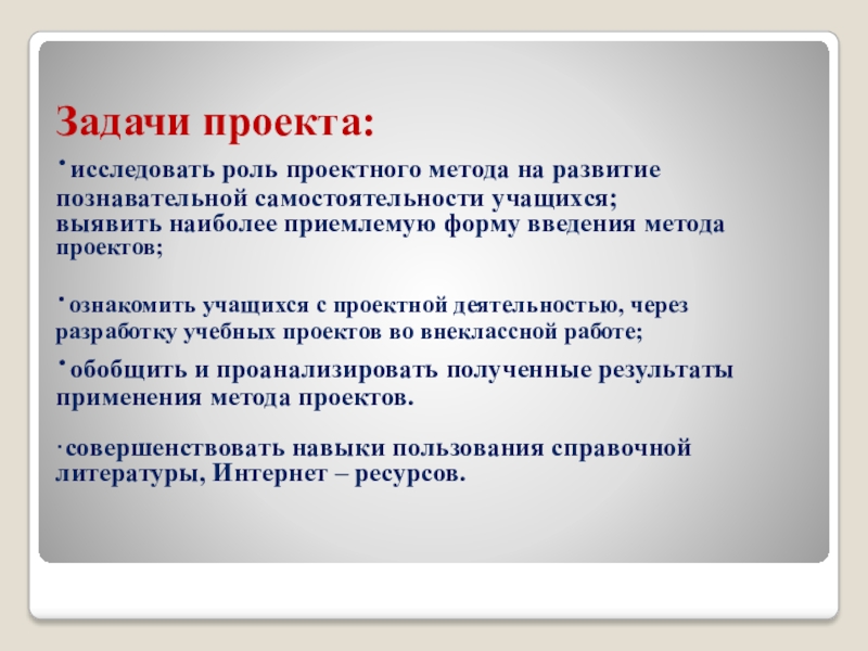 ·исследовать роль проектного метода на развитие познавательной самостоятельности учащихся;